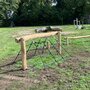 Het frame is vervaardigd uit hoogwaardig robinia hout, een duurzame houtsoort die bestand is tegen intensief gebruik en alle weersomstandigheden. Door de natuurlijke vorm en warme uitstraling past het parcours perfect in een groene of natuurlijke speelomgeving. De touwen zijn gemaakt van sterk, UV-bestendig staalkoordtouw dat extra veiligheid en langdurige stevigheid garandeert.