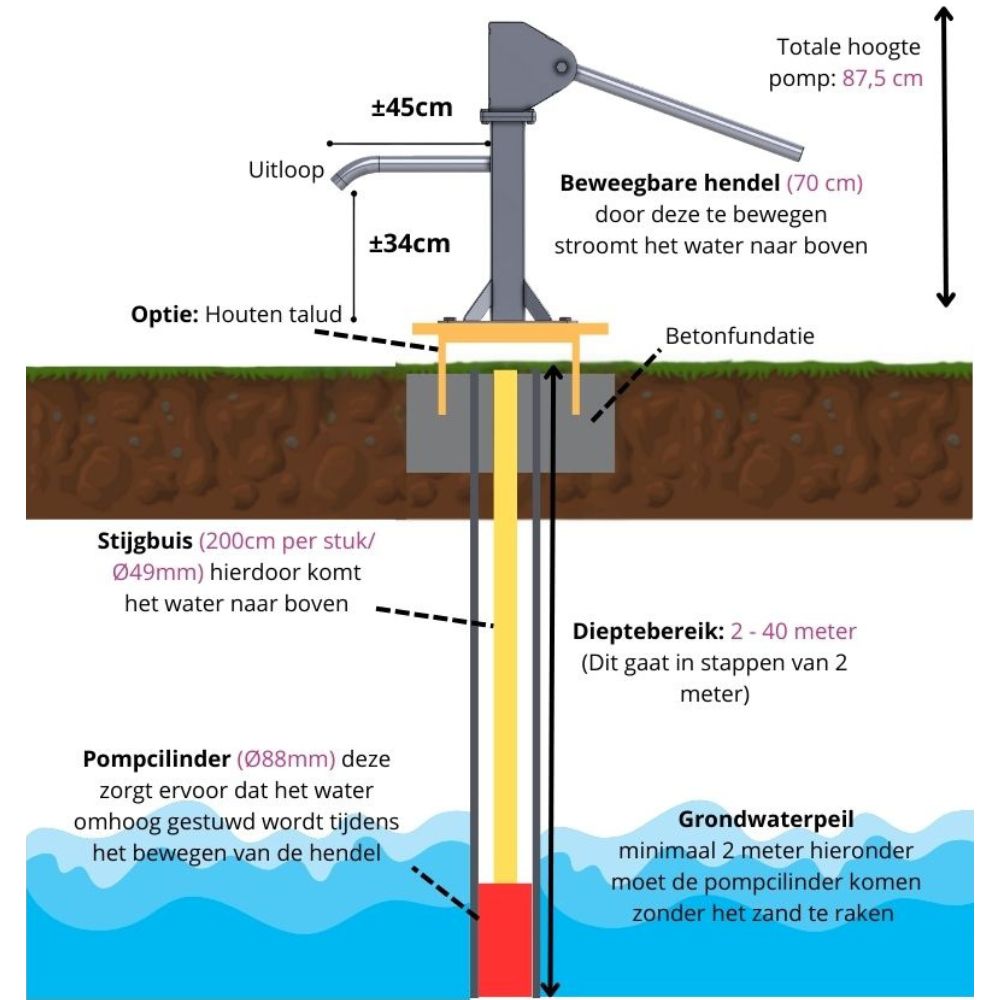 Deze uitvoering is speciaal ontwikkeld om eenvoudig te bedienen te zijn, ook door kinderen en ouderen. Daarnaast is de pomp voorzien van een solide basis die stevig verankerd kan worden, wat extra stabiliteit garandeert.