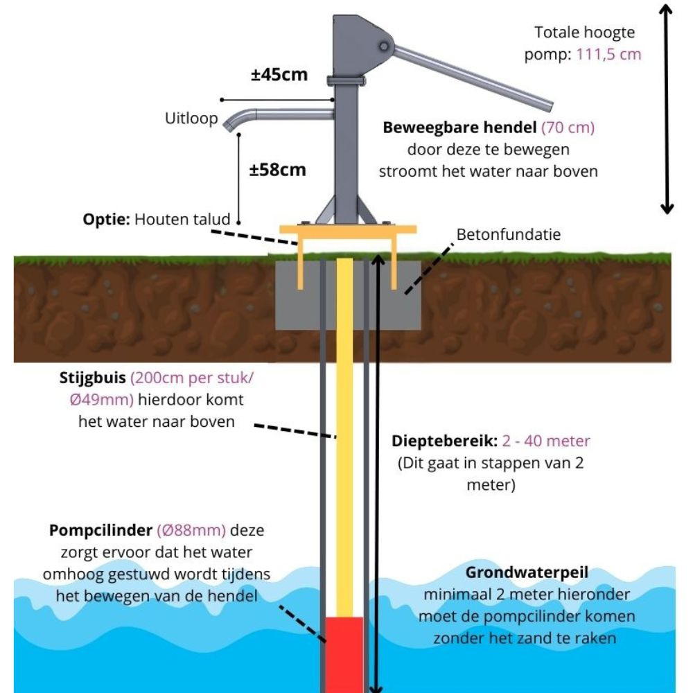 De Handpomp Robuust Verhoogde Uitvoering met Pompcilinder voor Openbaar Gebruik is speciaal ontworpen om eenvoudig en comfortabel water te pompen in openbare omgevingen. Dankzij de verhoogde uitvoering staat de pomp hoger, wat zorgt voor een ergonomischere werkhouding en een nog gebruiksvriendelijkere bediening. Dit maakt de pomp ideaal voor jong en oud.